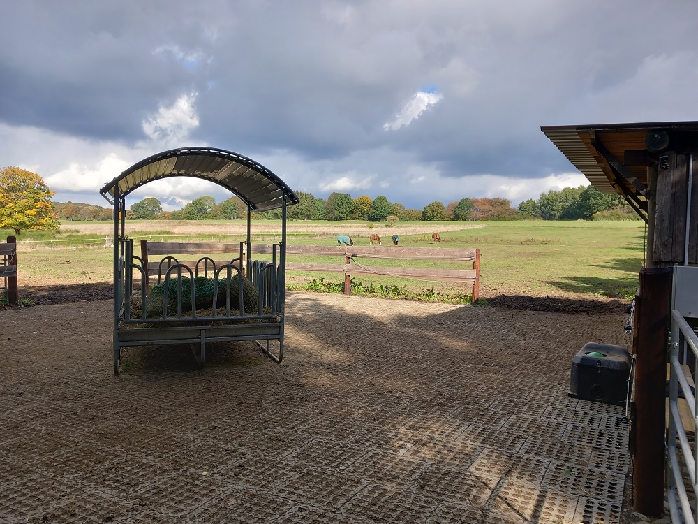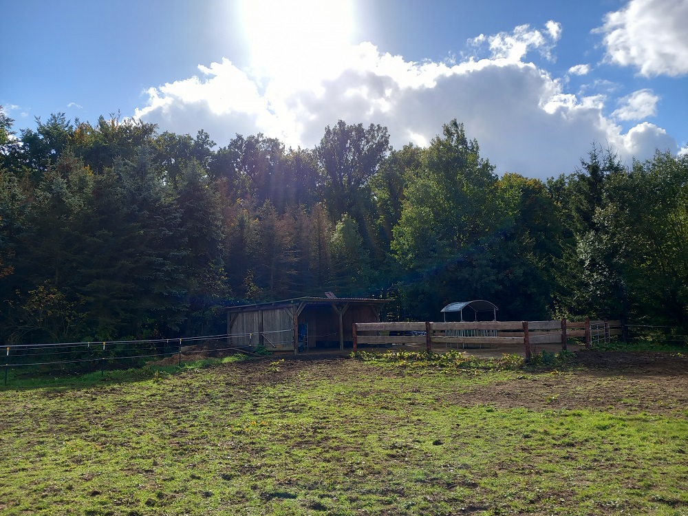 Hier wohne ich – unser Stall steht direkt am Waldrand. Wir können uns selbst aussuchen, ob wir Heu oder Gras fressen, im Unterstand oder draußen auf der Wiese stehen wollen.
